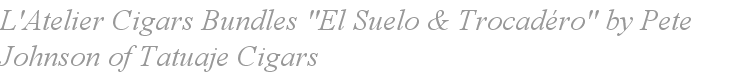 L'Atelier El Suelo and Trocadéro are available in bundles of 20 cigars in 3 sizes and feature a Habano Osuro and Ecuadorian wrapper with a Broadleaf binder and all Nicaraguan, long leaf filler with some Broadleaf in the blend as well blended by Pete Johnson and manufactured by My Father Cigar factory.